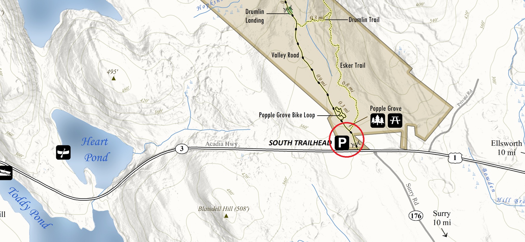 The project is on the GPMCT Wildlands property, a 5200-acre preserve in Orland, Maine. The Parking area is adjacent to the existing parking area at 1574 Acadia Highway, Orland, along the western side of the Valley Road.