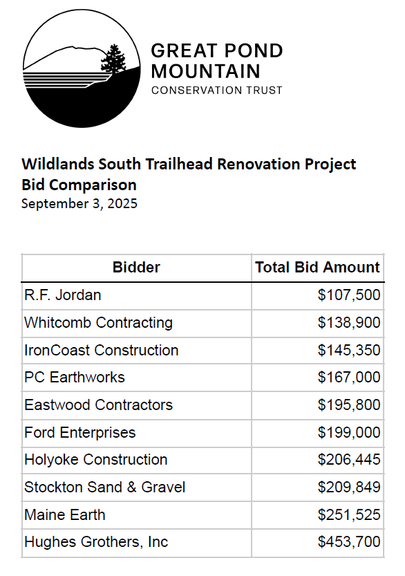 • All bid documents and answers to questions will be posted at https://www.greatpondtrust.org/southtrailhead/ Password: South
